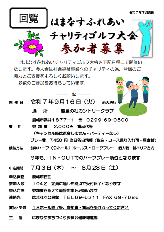 はまなすまちづくり委員会主催事業により、今年も『はまなすふれあいチャリティゴルフ大会』を下記日程にて行います。
