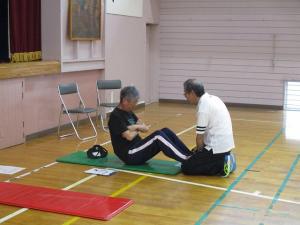 66歳~84歳の14人の参加者が、握力、上体起こし、長座体前屈、開眼片足立ち、10m障害物競争、6分間歩行の6種目に挑戦しました。
