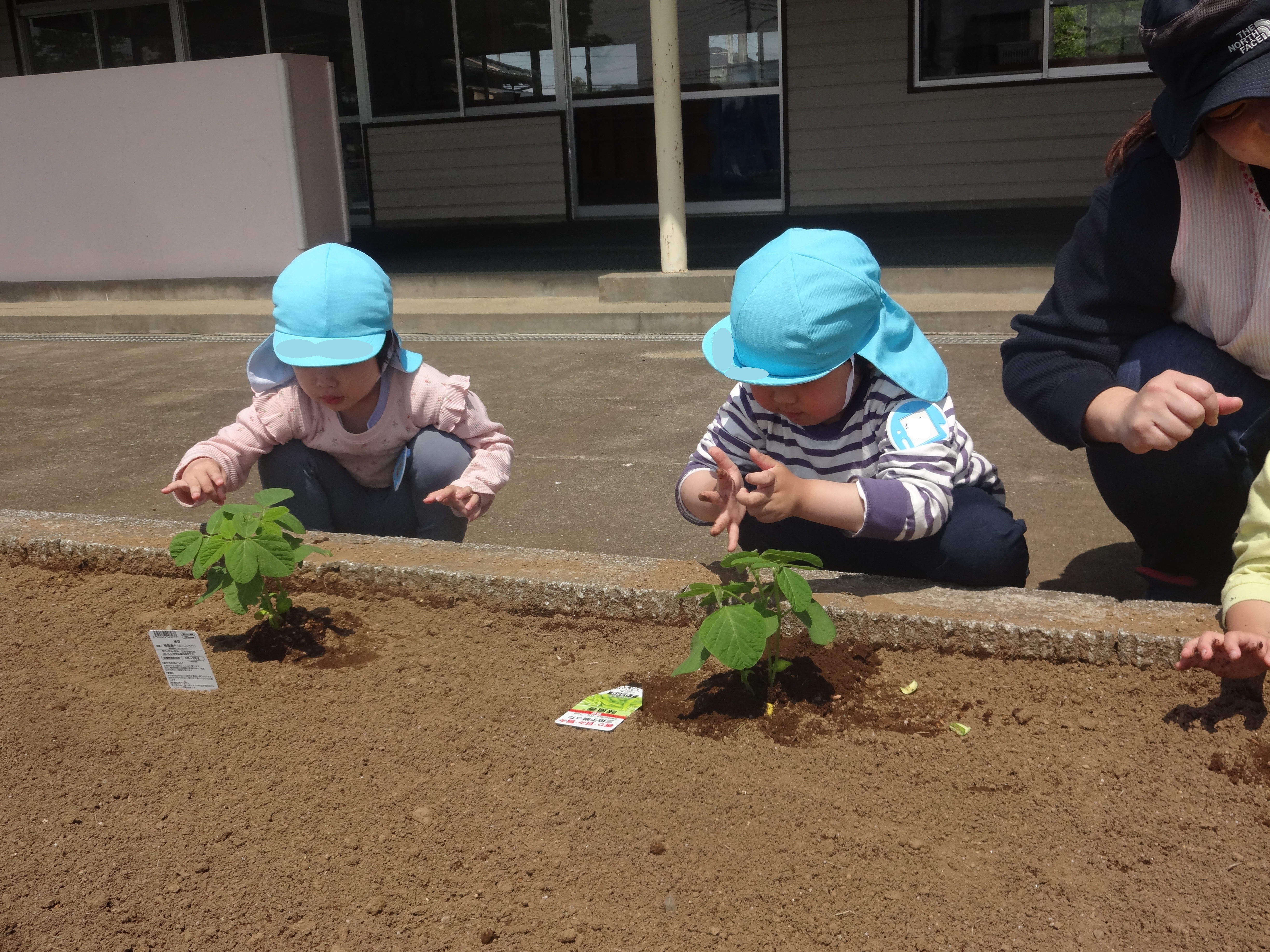 次は畑に野菜の苗を植えました。クラスで話し合いをした結果、今年は枝豆、ミニトマト、ピーマンを育てることにしました。