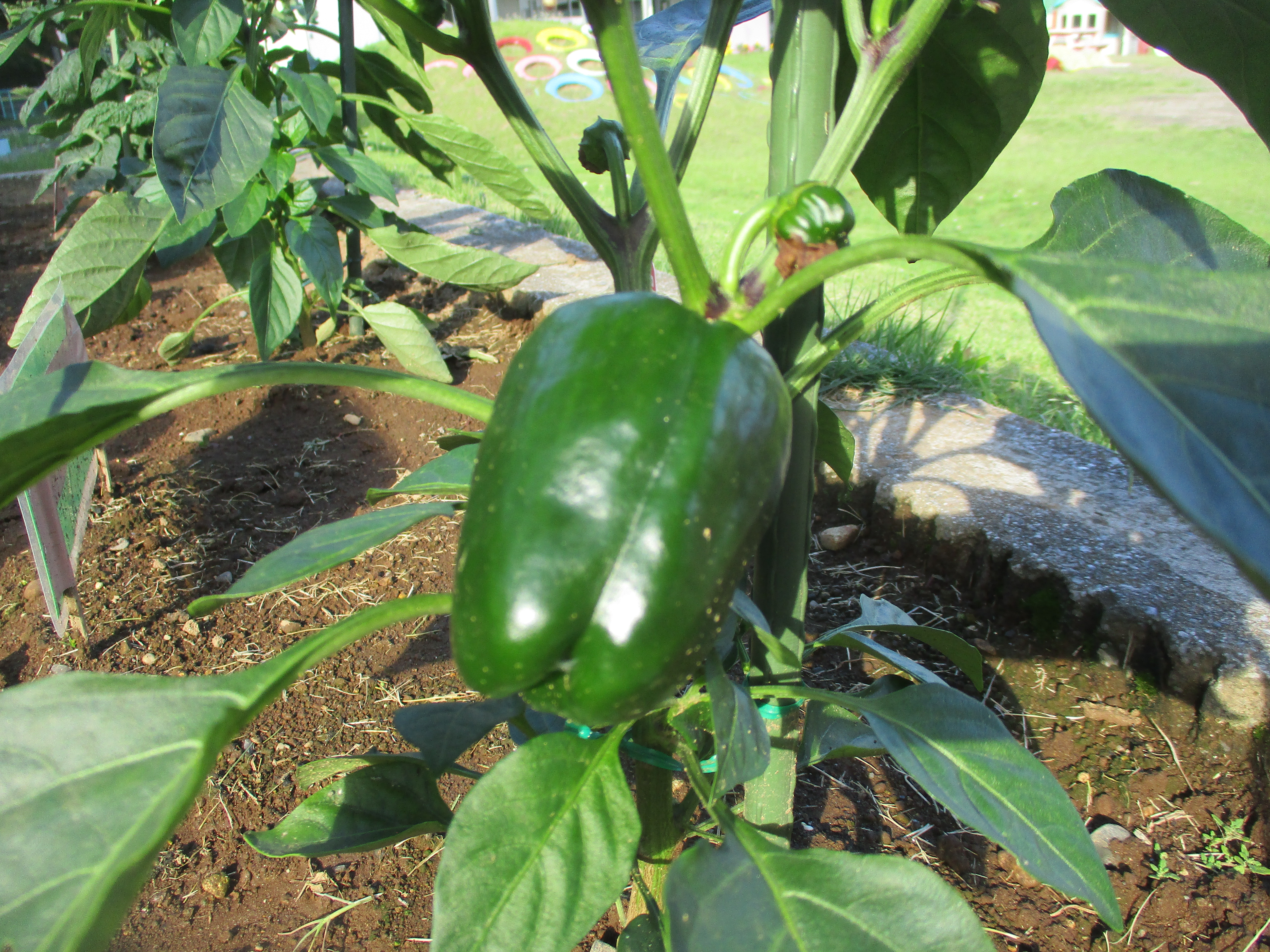 5月に植えた夏野菜。みんなで水やりをしながら大事に育ててきました。その中でピーマンが1つ大きくなり、収穫をしました!