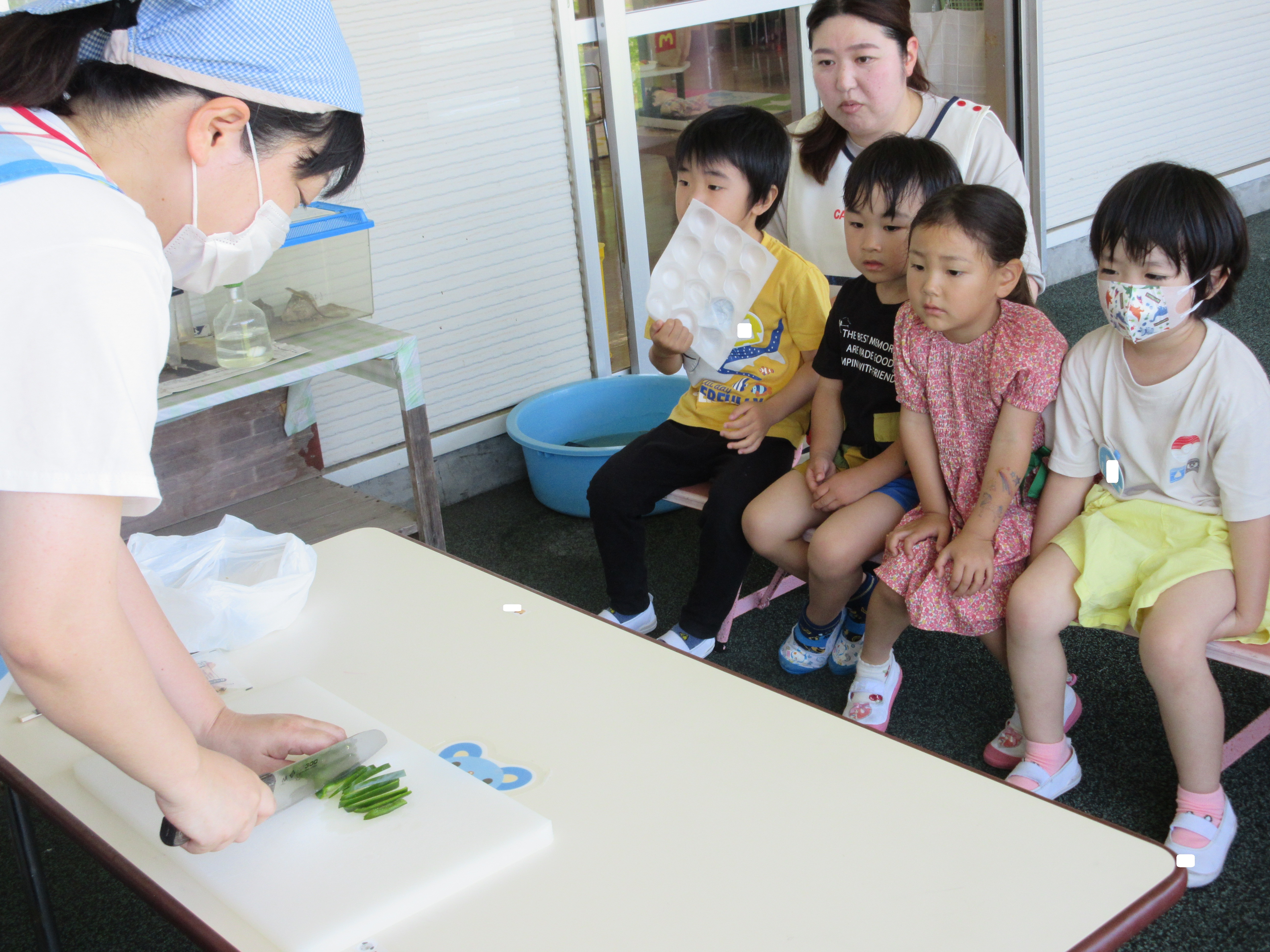 包丁で切ってみると、「ピーマンのにおいがするね!」「種がいっぱいだね」「すごいね!」とそれぞれの発見や驚きを話していました。「先生頑張って」「気をつけてね!」と優しい応援もありました。