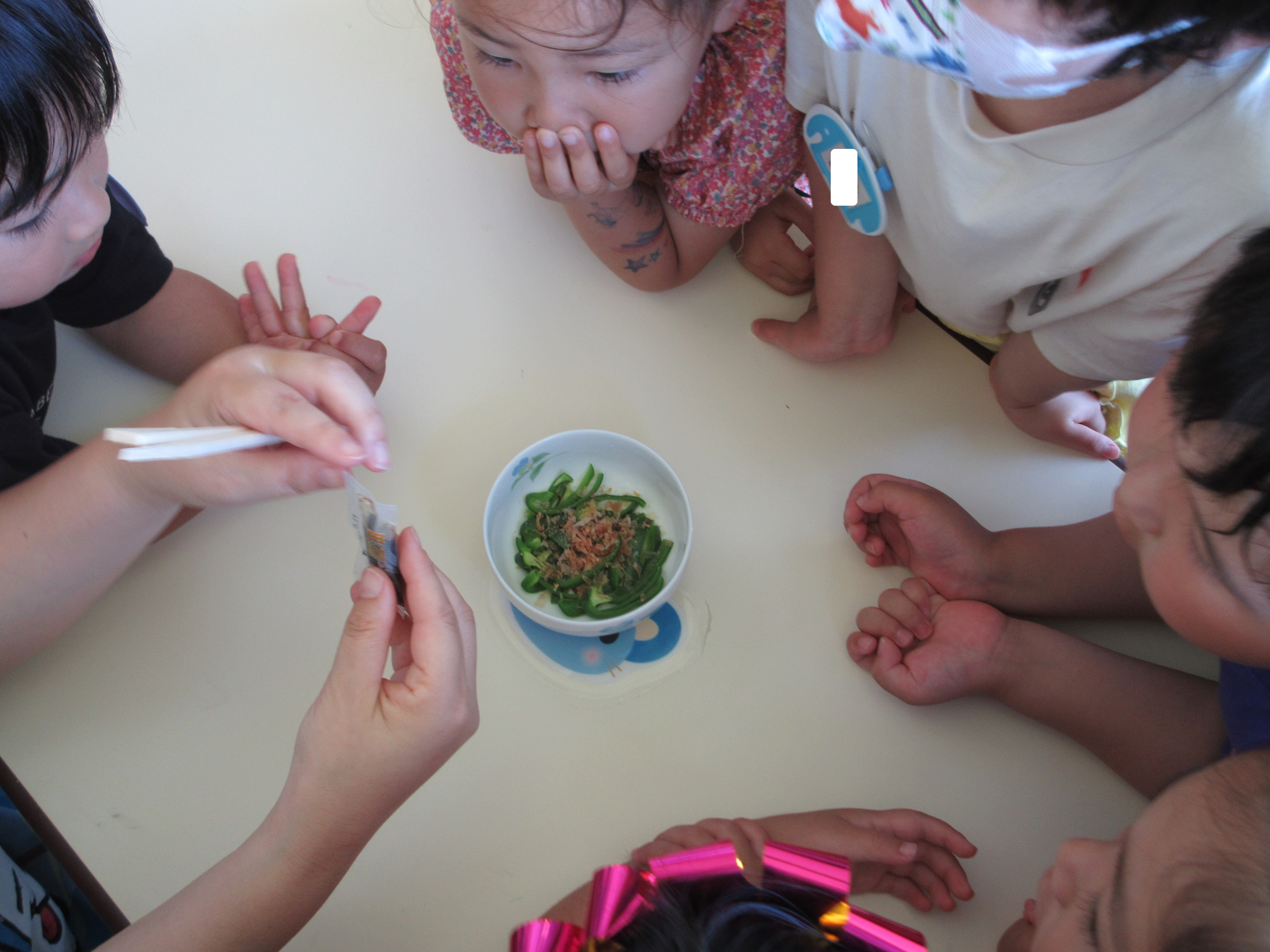 最後にかつおぶしと醤油で味付けをして完成です!「わ~!いいにおい~」みんなワクワクしています