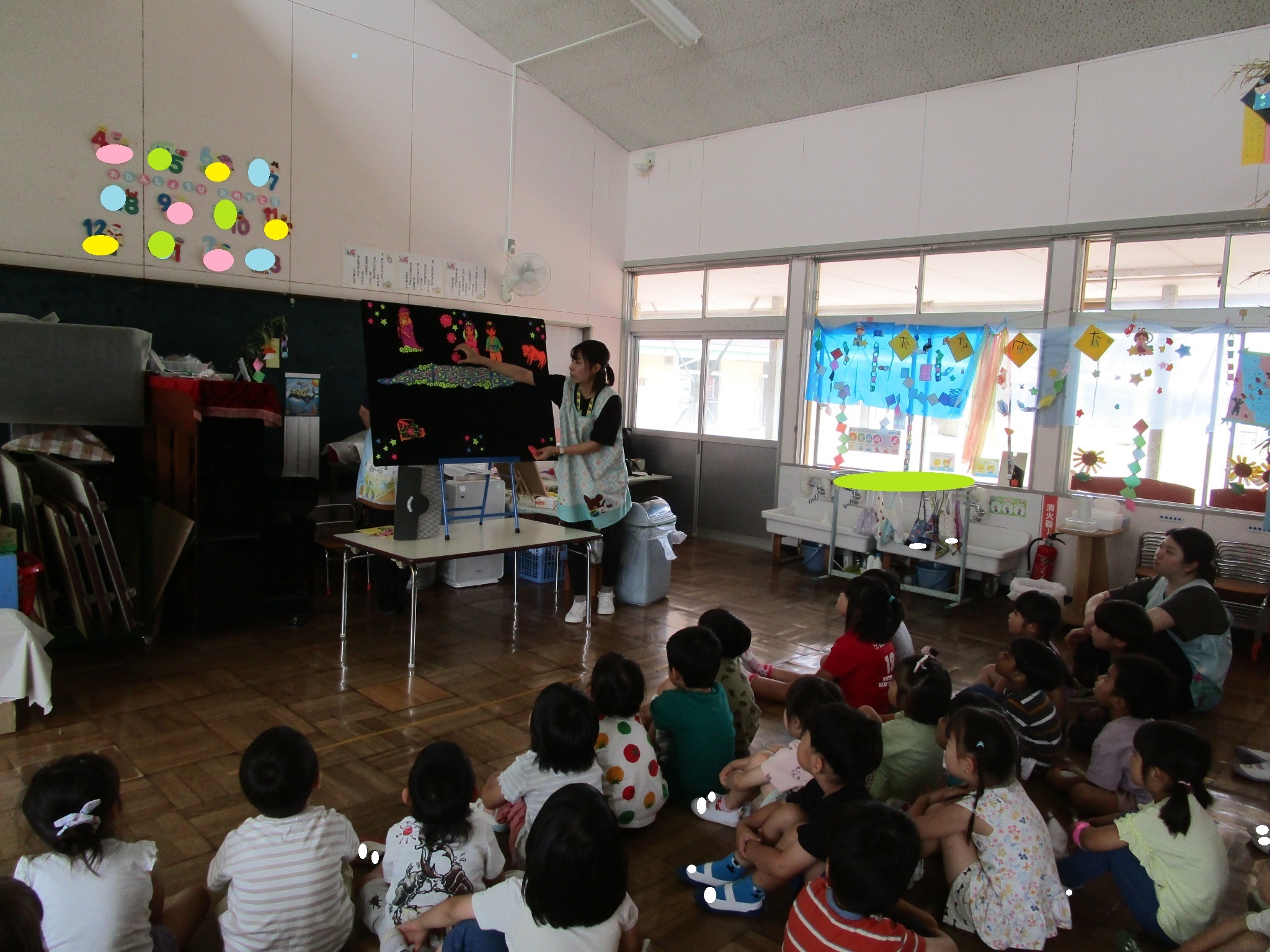 続いて、七夕にちなんだパネルシアター「おりひめとひこぼし」を見て、七夕の由来も理解できました。