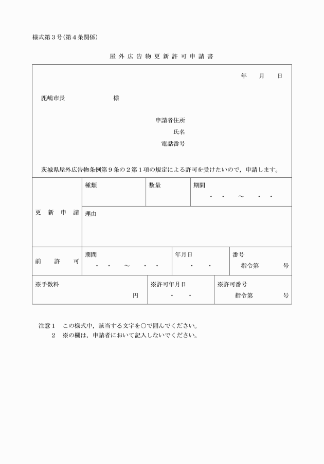 第4条 県条例第9条の2第1項の規定による許可の更新の申請は,県条例第6条又は第7条第4項から第6項までの規定により受けた許可期間が満了する2週間前までに,屋外広告物更新許可申請書(様式第3号)に当該広告物等のカラー写真(申請の日前3月以内に撮影したもの)を添えて市長に提出することにより行わなければならない。