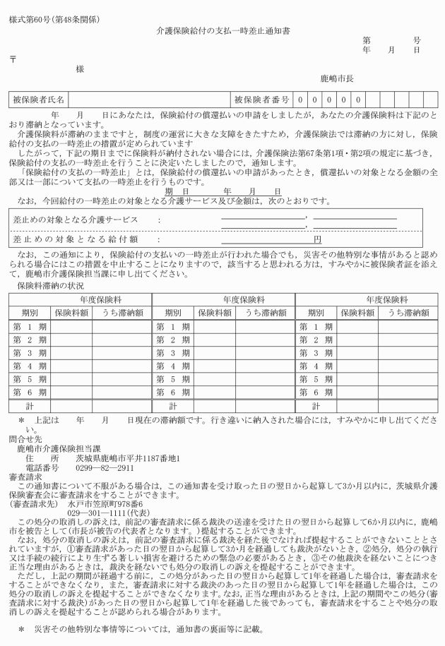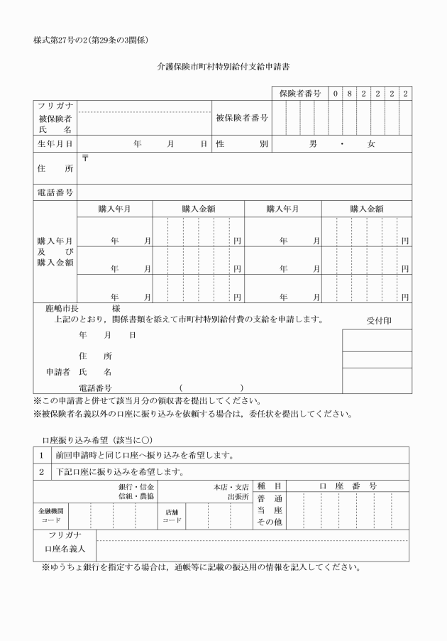 添付書類 | (1) 介護保険料徴収猶予に係る収入申告書 (2) その他必要と認める書類 ただし,申請書の内容を公簿等によって確認することができるときは,添付書類を省略することができる。 |