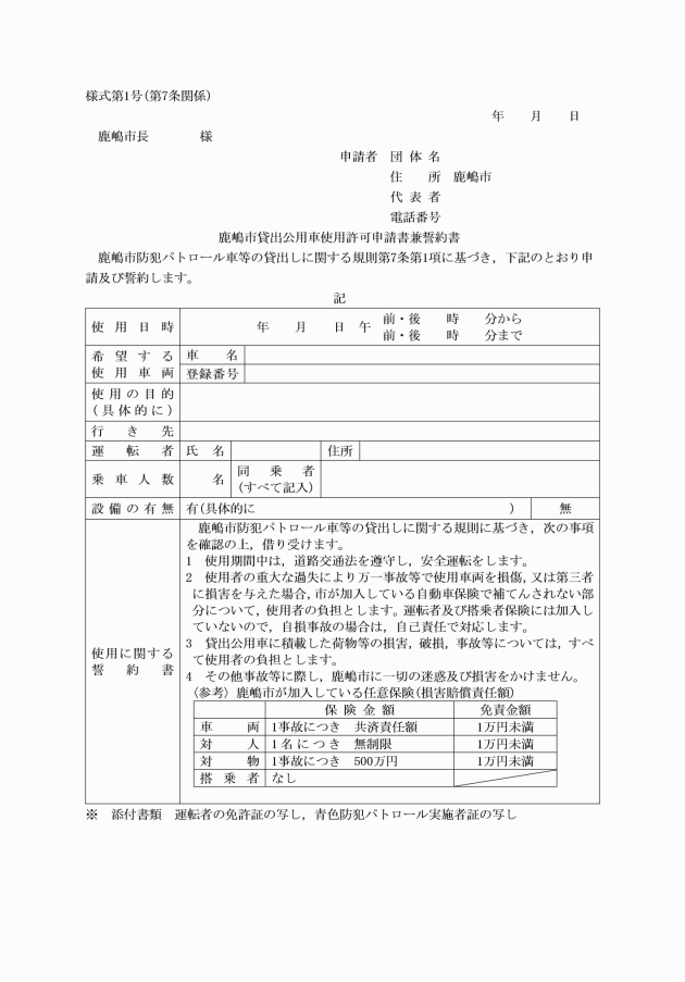 第7条 車両を使用しようとする団体の代表者(以下「使用者」という。)は,貸出しを受けようとする日の1箇月前から7日前までに,鹿嶋市貸出公用車使用許可申請書兼誓約書(様式第1号。以下「申請書」という。)に対象車両を運転する者の運転免許証の写しを添えて市長に提出しなければならない。