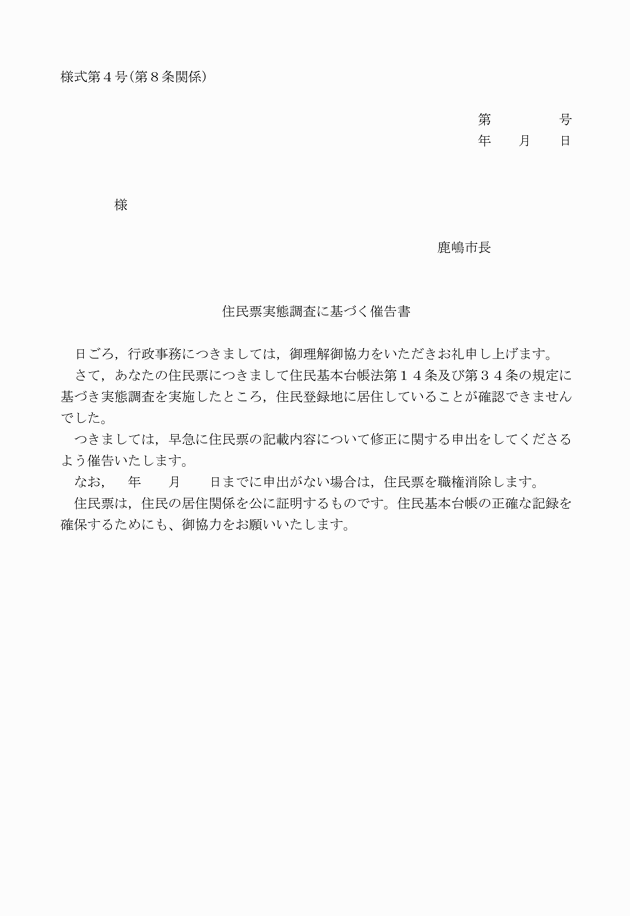 第8条 実態調査の結果,不現住の者の居所が判明した時は,不現住の者に対し,期限を定めて住民票実態調査に基づく催告書(様式第4号)を送付するものとする。
