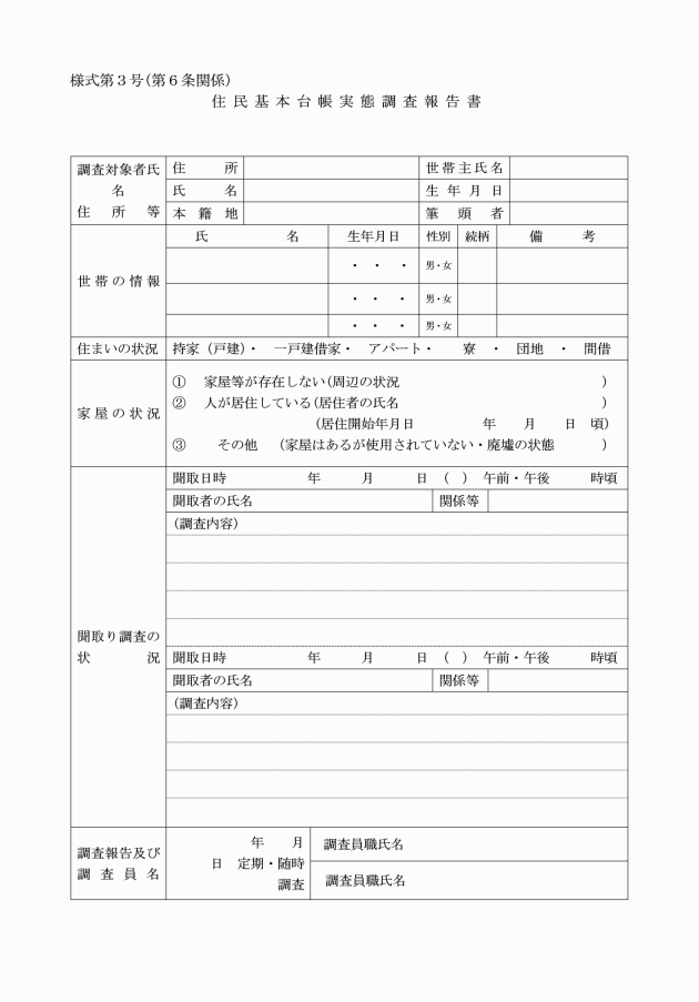 第6条 調査員は,実態調査を実施したときは住民基本台帳実態調査報告書(様式第3号)を作成し,住民基本台帳事務担当課長に調査の内容を報告しなければならない。
