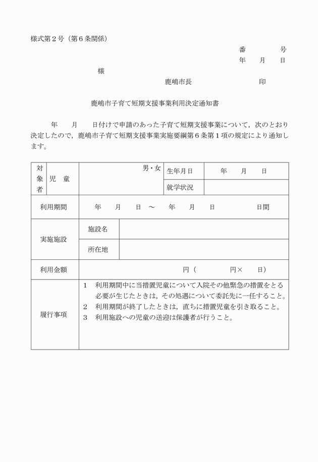 第5条 事業を利用しようとする者(以下「申請者」という。)は,鹿嶋市子育て短期支援事業利用申請書(様式第1号)を市長に提出しなければならない。