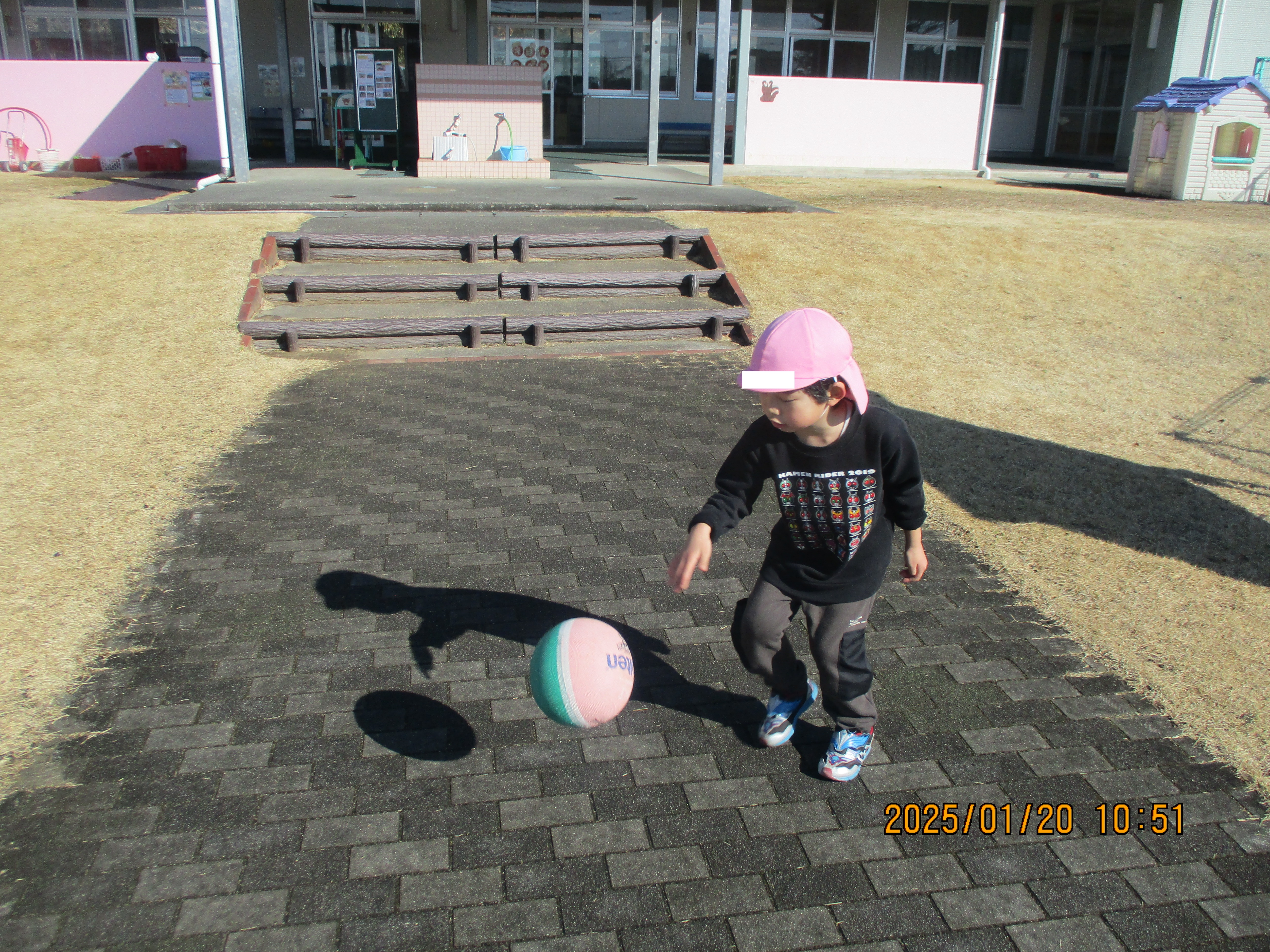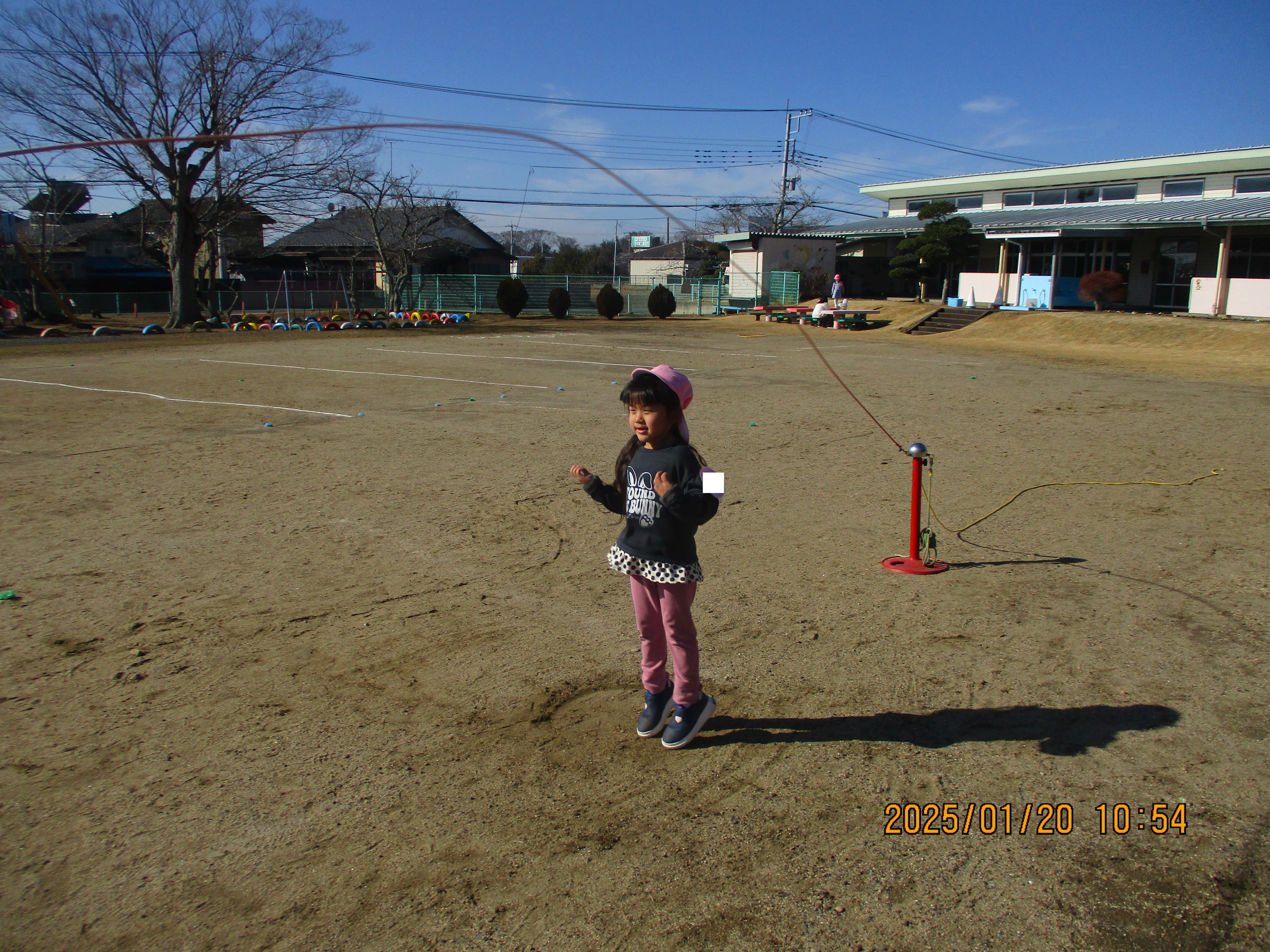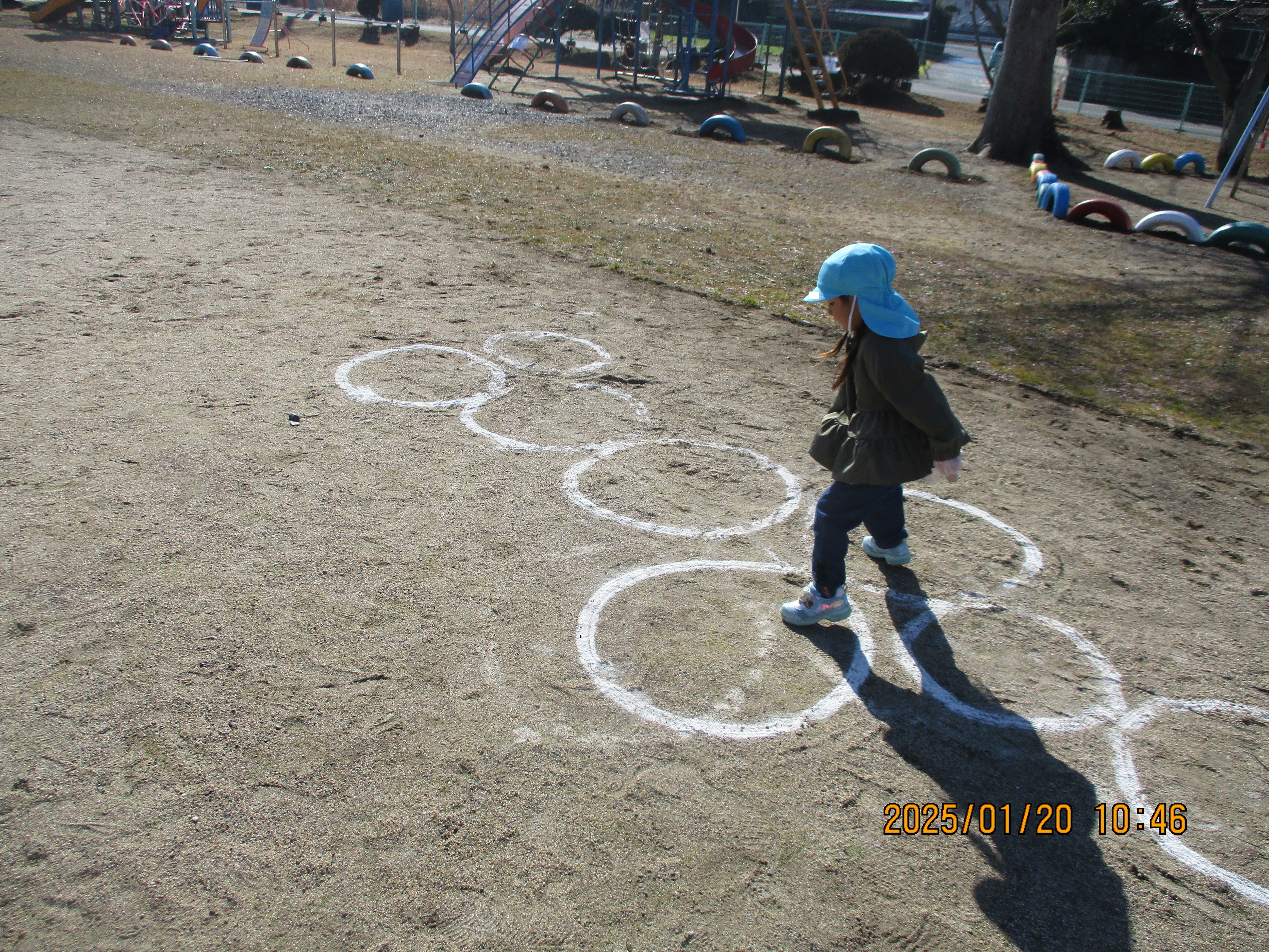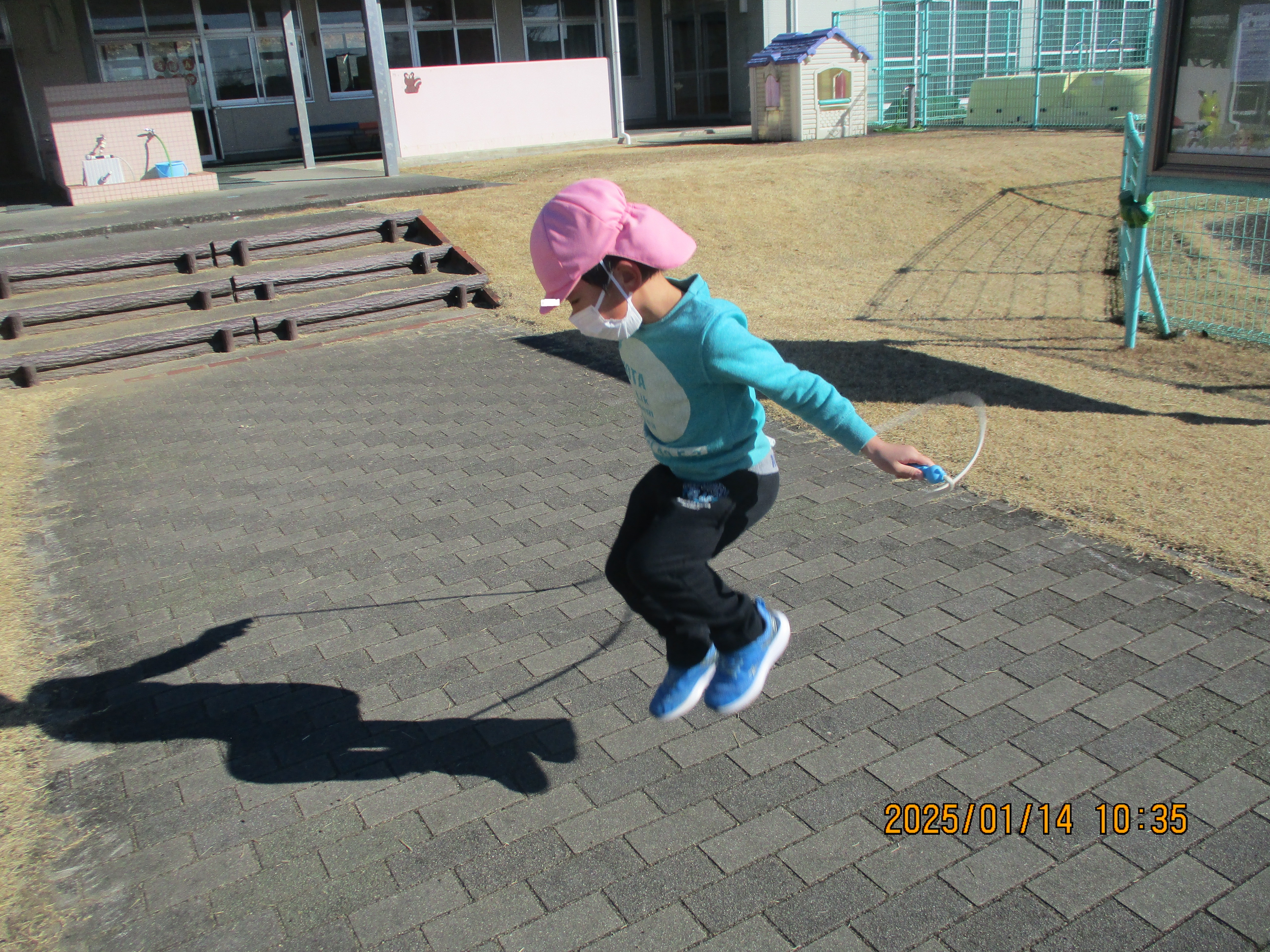 まだまだ厳しい寒さが続いていますが、子どもたちは外で元気に体を動かして遊んでいます。鬼ごっこや、サッカー、ドッジボールなど好きな遊びを楽しむ中で、『チャレンジカード』でいろいろな遊びにも挑戦しています。『チャレンジカード』は年齢に応じて項目が違い、年少さんは、「ケンケンパ・長縄跳び5回・鉄棒前回り」などに挑戦しています。年長さんになると、「縄跳びは○○回、ボールつきは○○回」と、自分たちで目標を決めて取り組んでいます。