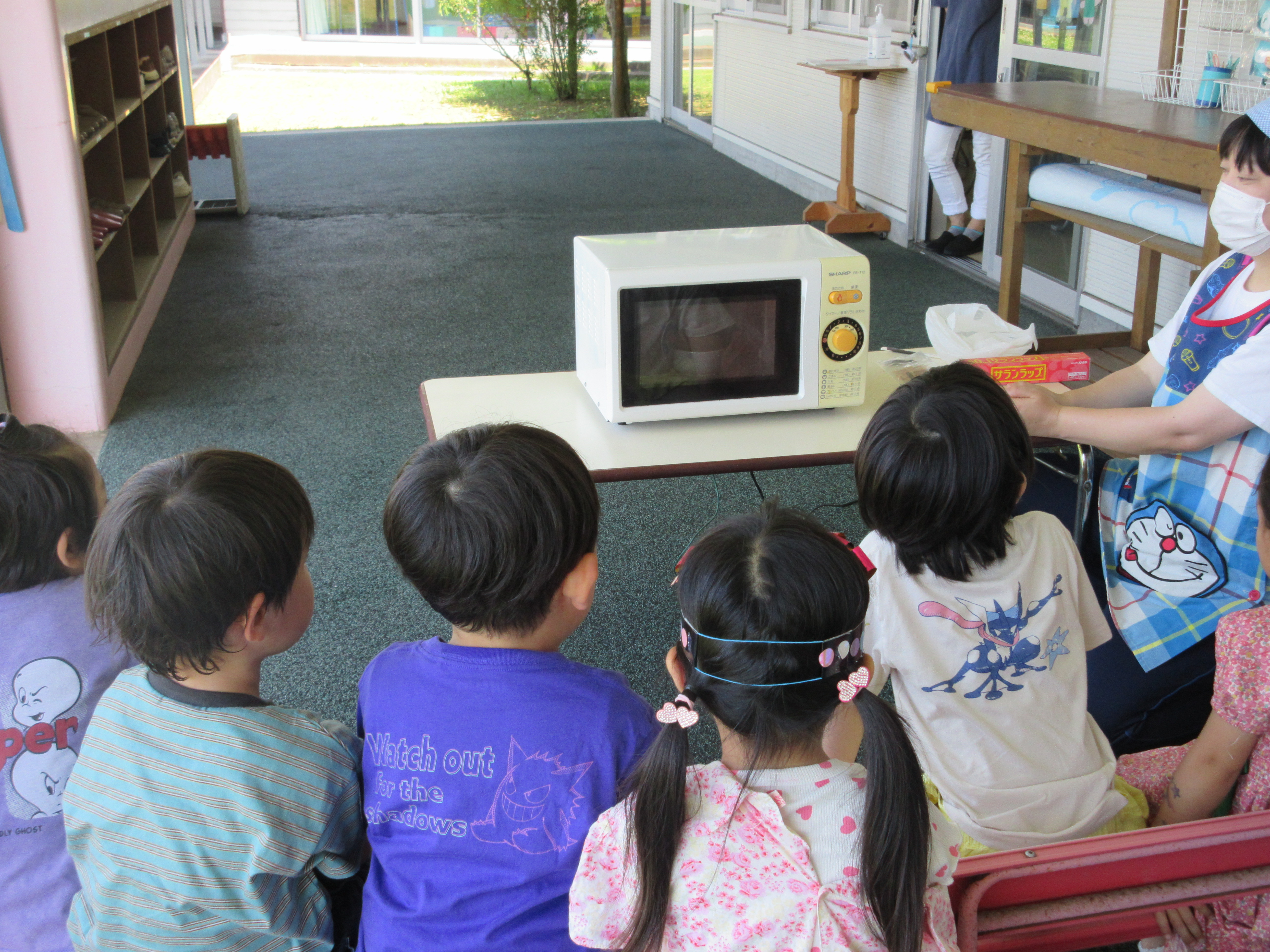 切ったピーマンを電子レンジで温めていきます。「1・2・3・4…」みんなで数えながら出来上がりを楽しみに待っています