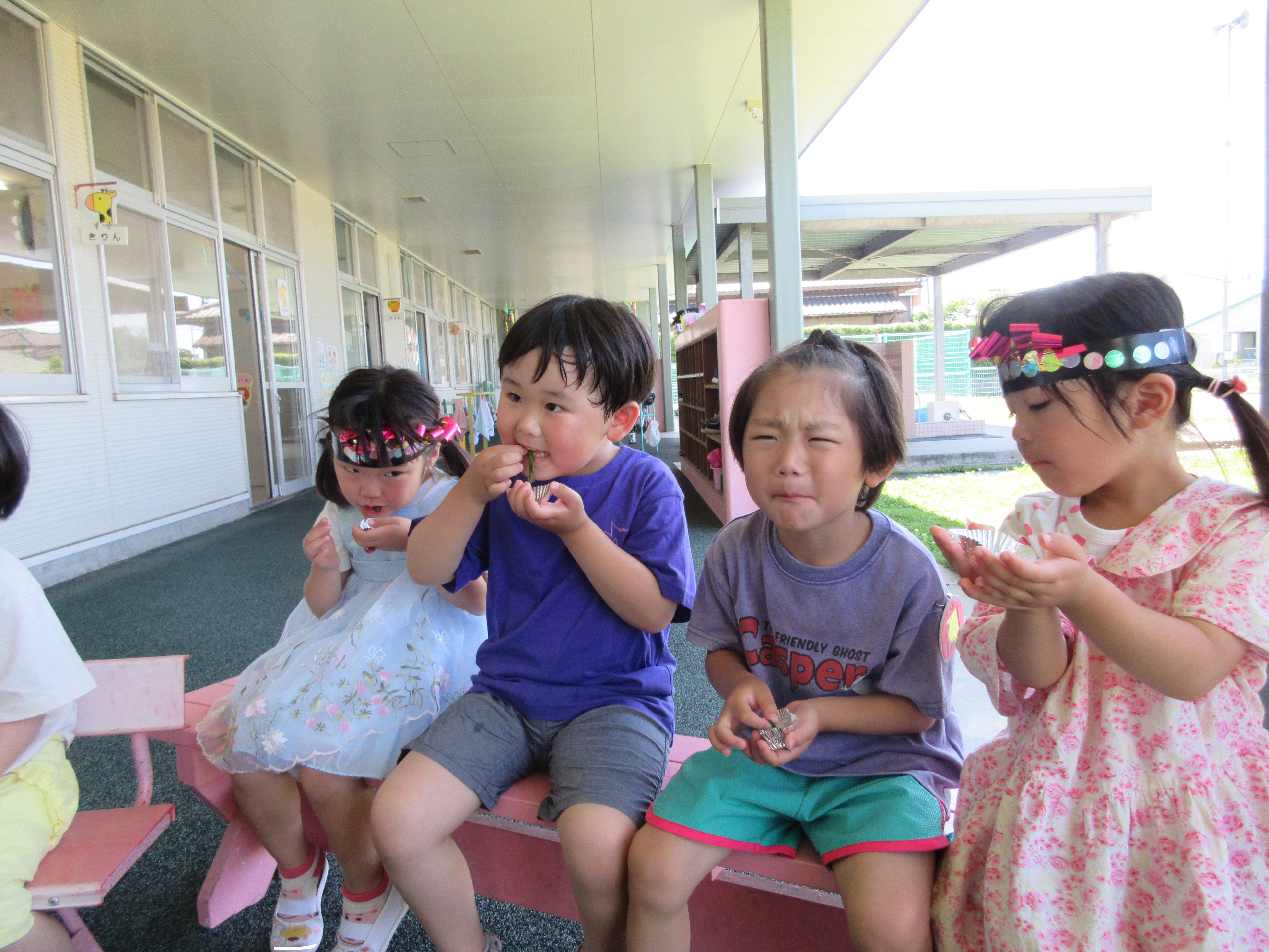 ピーマンは苦手な子も多い野菜ですが、みんなで一緒に食べてみると、パクパク止まらず「全部食べられたよ!」と嬉しそうに話す姿がありました。自分たちで育てた野菜は特別ですね!「次はトマトかな?」「どうやって食べようか?」と次の収穫を楽しみにしている子どもたちでした。