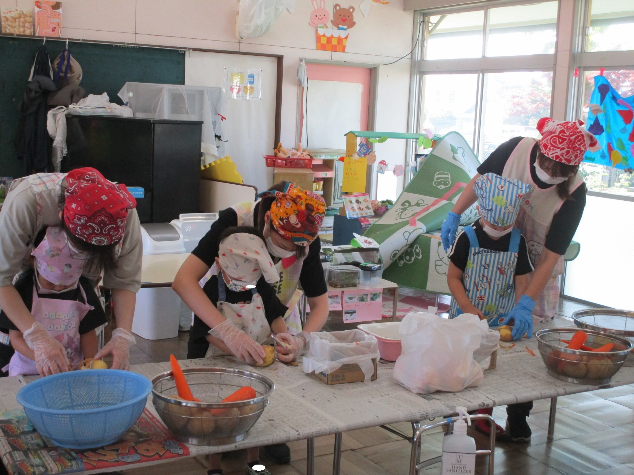 年中ひまわり組は、けがをしないように気を付けながら、じゃがいもと人参の皮をピーラーで、玉ねぎの皮を手でむきました。