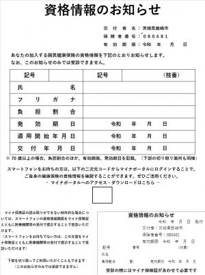 ↑国民健康保険の「資格情報のお知らせ」(見本)